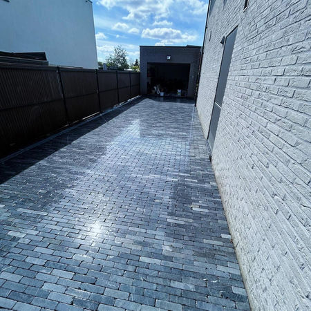 Te Moorsele mochten we deze oprit voorzien van Blauwsteentjes en betonklinkers.